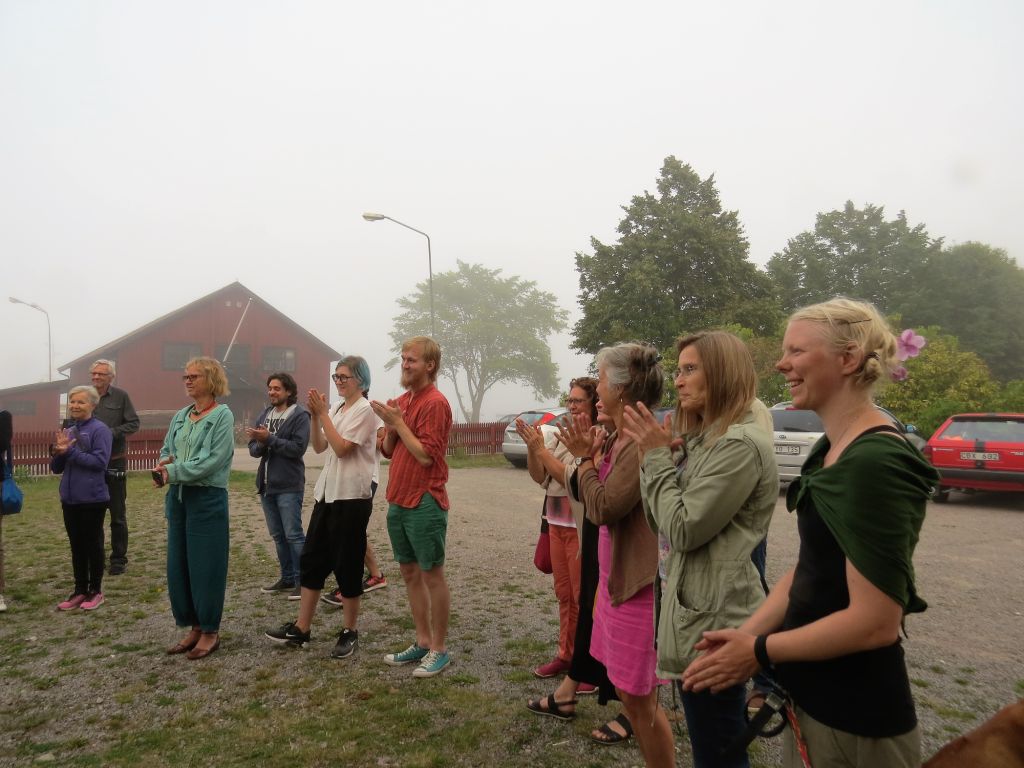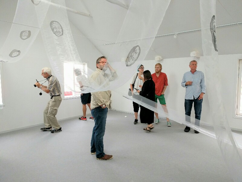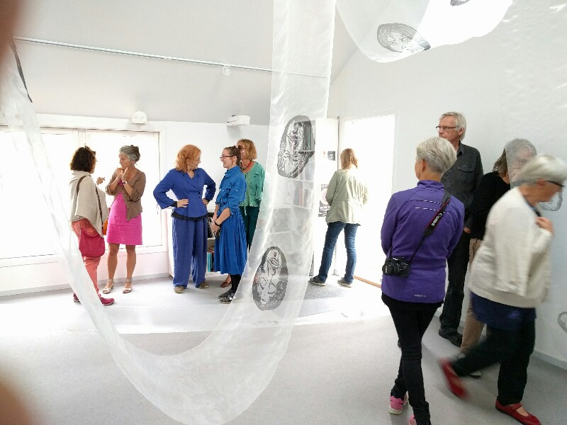 Många dök upp för att titta på hennes tryckta ansikten på de ljusgenomsläppliga, skira tygerna. Tyvärr hörde jag aldrig hela förklaringen, men det var i något skede av tryckandet som hon kommit på att använda knäna istället för baksidan av en sked, om jag uppfattade det hela rätt.